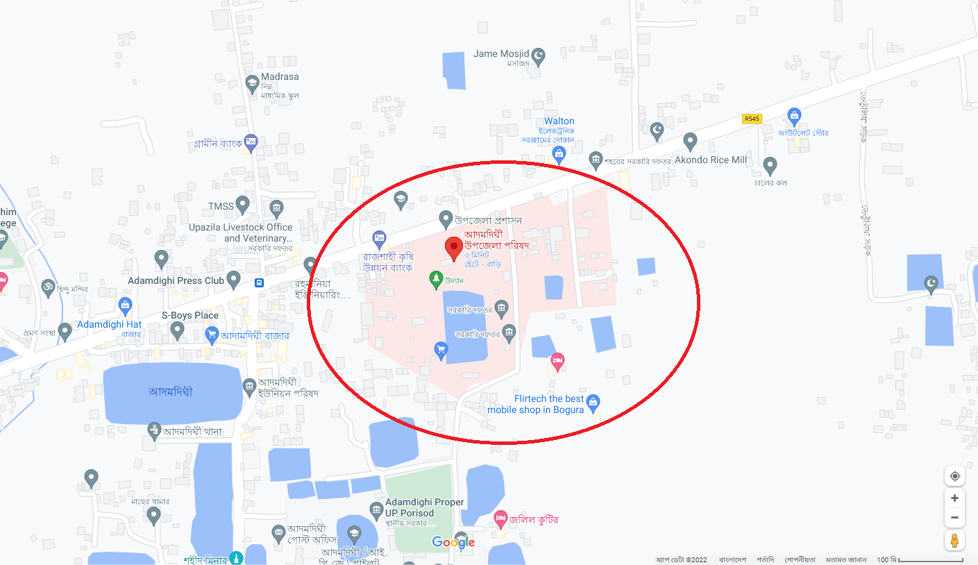 আদমদীঘি বাস স্ট্যান্ড-> আদমদীঘি উপজেলা কমপ্লেক্স->সহকারী প্রোগ্রামারের কার্যালয় গুগল ম্যাপ